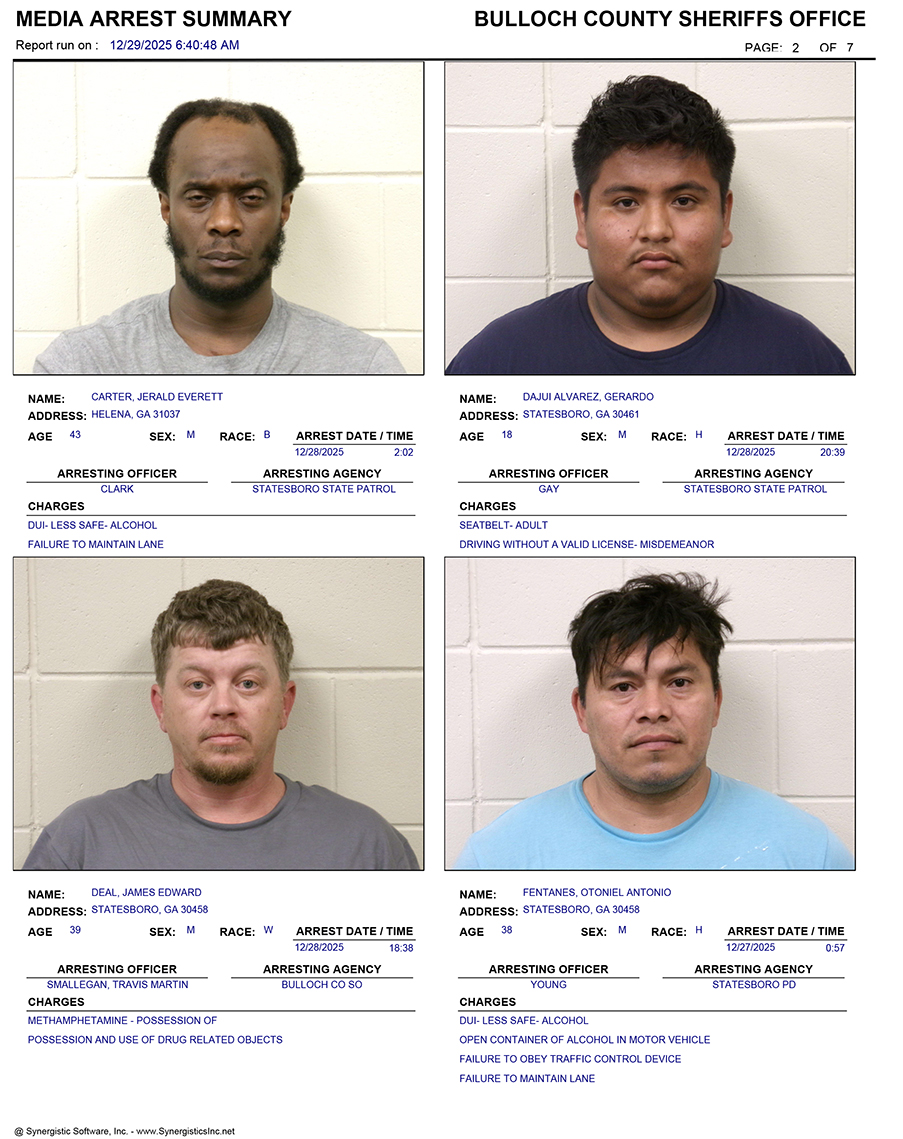 These records are matters of public information provided by the Bulloch County Sheriff’s Office. Booking reports are details of arrests only. All persons below are considered to be innocent unless proven otherwise in a court of law.