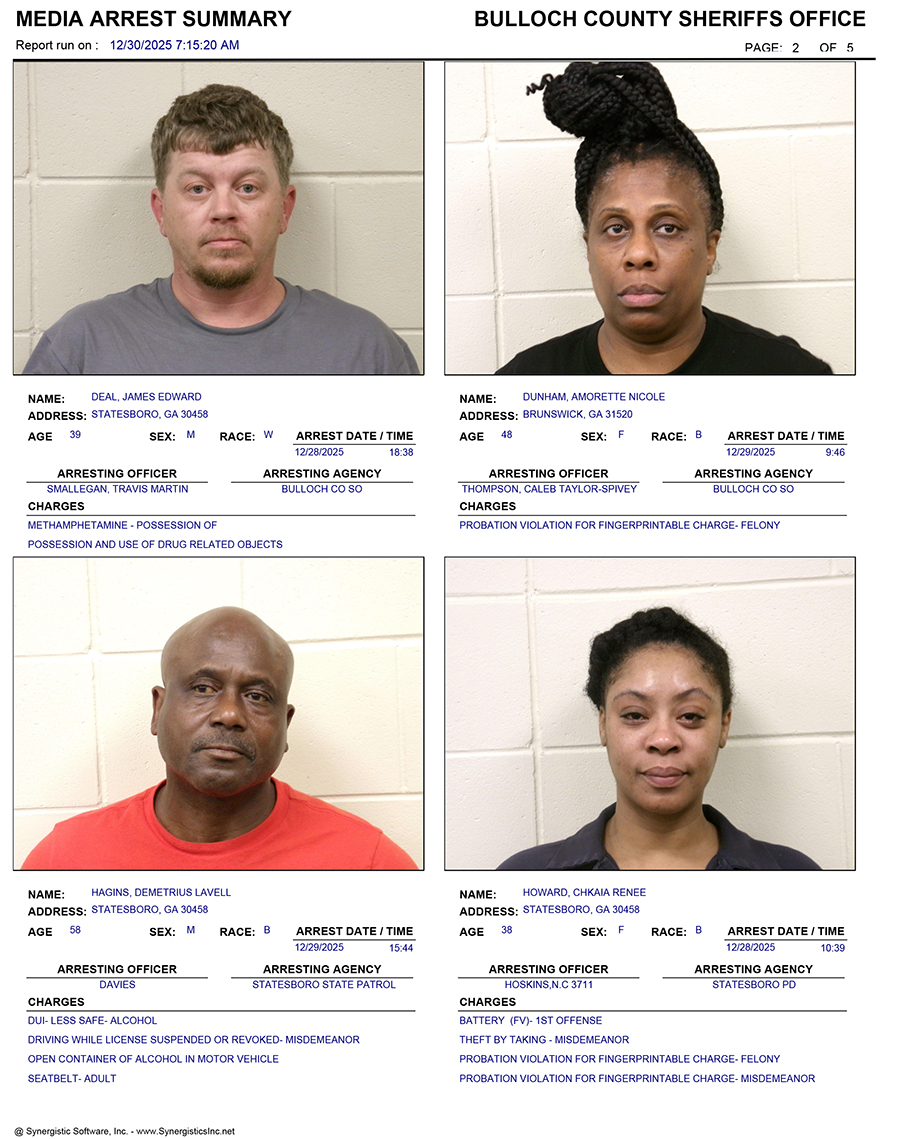 These records are matters of public information provided by the Bulloch County Sheriff’s Office. Booking reports are details of arrests only. All persons below are considered to be innocent unless proven otherwise in a court of law.