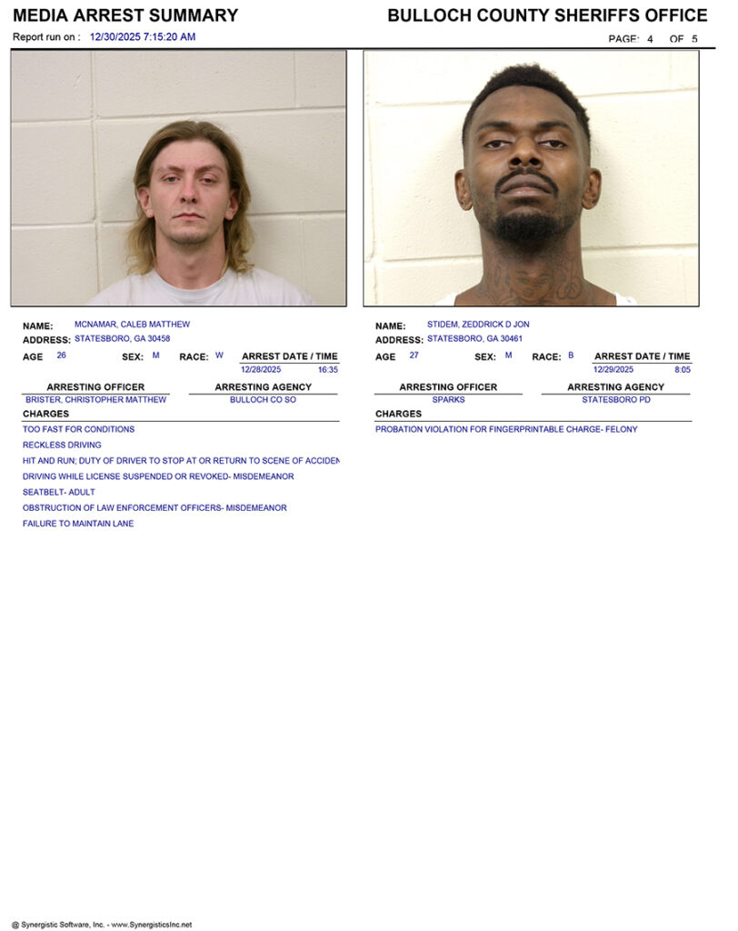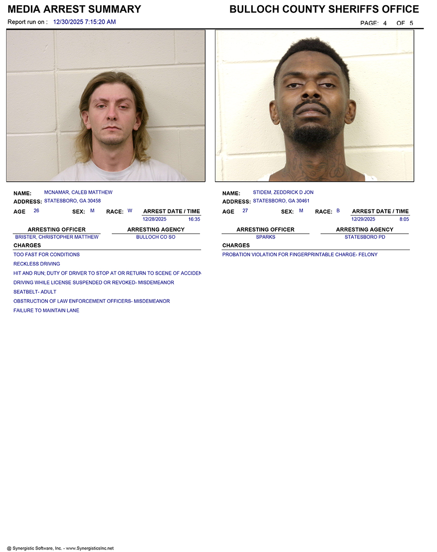 These records are matters of public information provided by the Bulloch County Sheriff’s Office. Booking reports are details of arrests only. All persons below are considered to be innocent unless proven otherwise in a court of law.