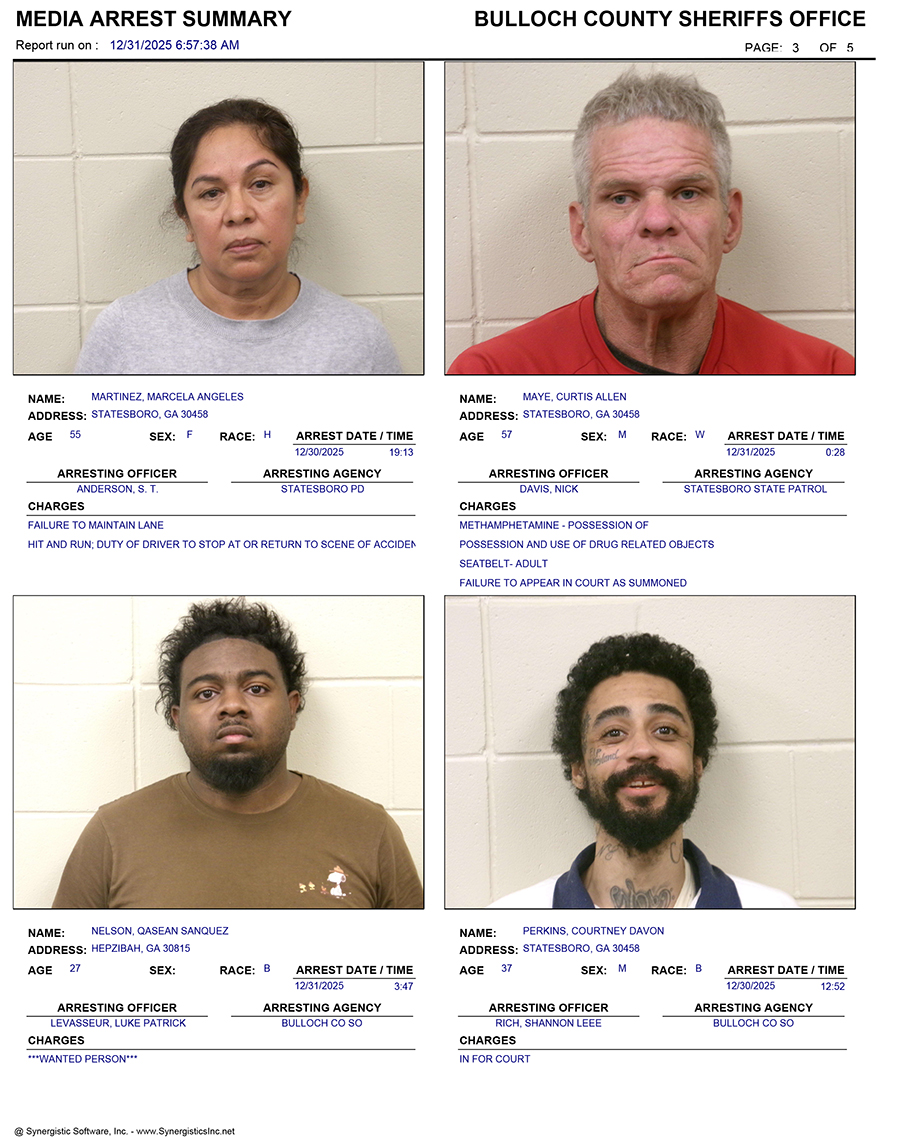 These records are matters of public information provided by the Bulloch County Sheriff’s Office. Booking reports are details of arrests only. All persons below are considered to be innocent unless proven otherwise in a court of law.