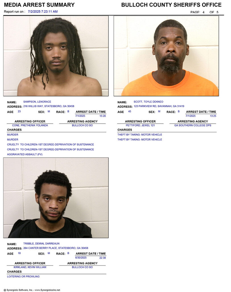 These records are matters of public information provided by the Bulloch County Sheriff’s Office. Booking reports are details of arrests only. All persons below are considered to be innocent unless proven otherwise in a court of law.