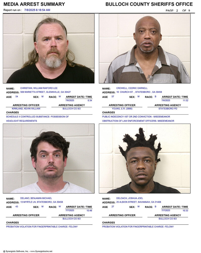 These records are matters of public information provided by the Bulloch County Sheriff’s Office. Booking reports are details of arrests only. All persons below are considered to be innocent unless proven otherwise in a court of law.