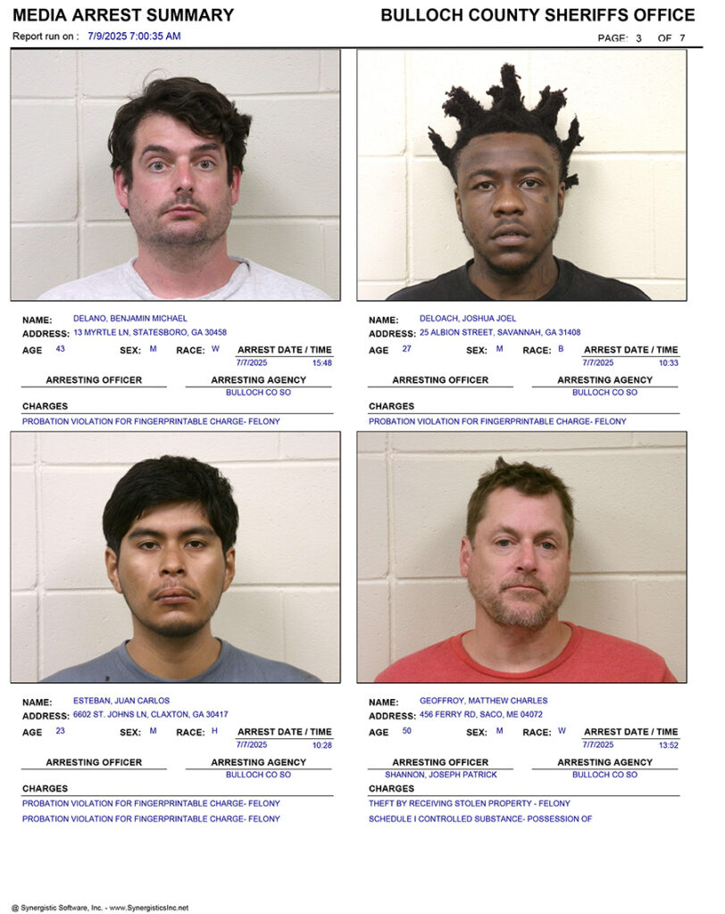 These records are matters of public information provided by the Bulloch County Sheriff’s Office. Booking reports are details of arrests only. All persons below are considered to be innocent unless proven otherwise in a court of law.