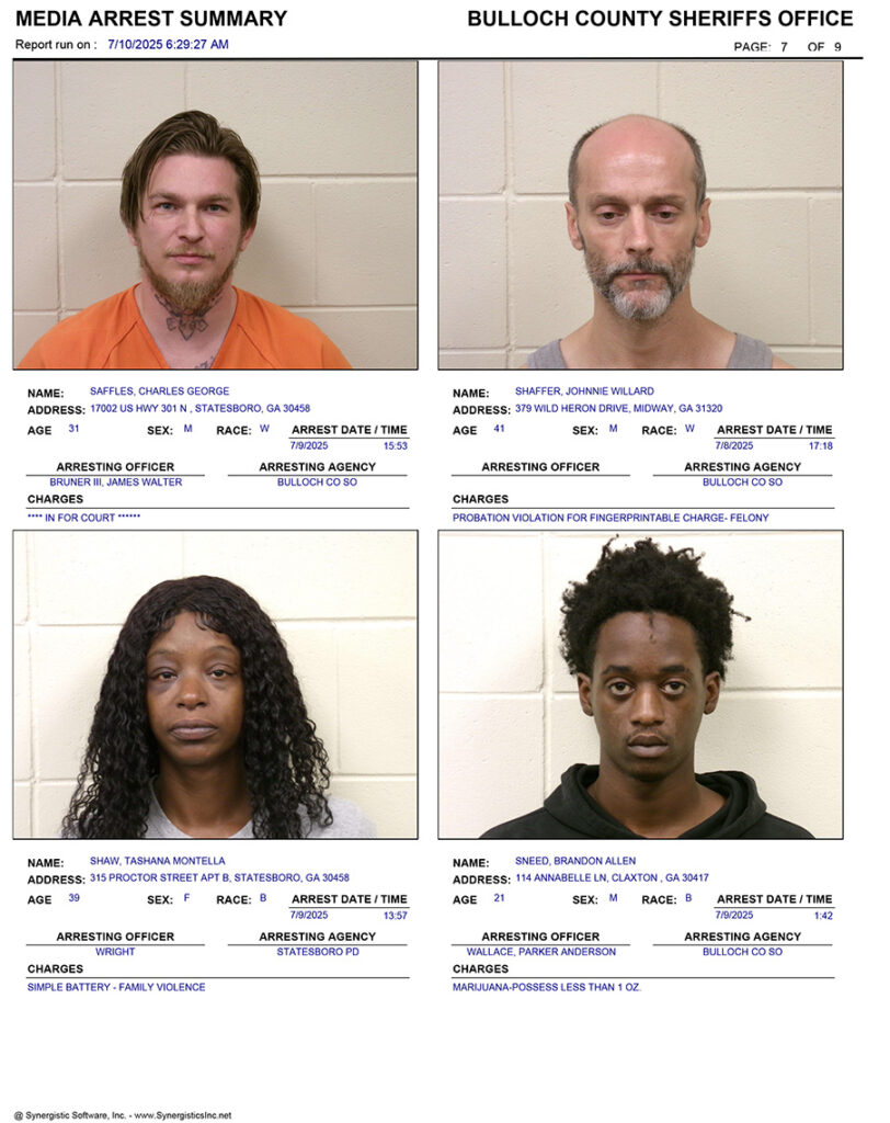 These records are matters of public information provided by the Bulloch County Sheriff’s Office. Booking reports are details of arrests only. All persons below are considered to be innocent unless proven otherwise in a court of law.
