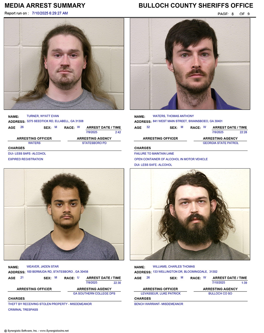 These records are matters of public information provided by the Bulloch County Sheriff’s Office. Booking reports are details of arrests only. All persons below are considered to be innocent unless proven otherwise in a court of law.