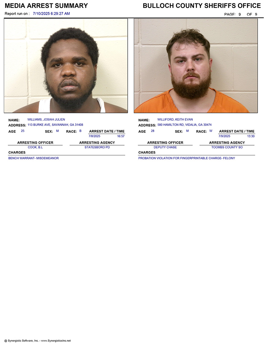 These records are matters of public information provided by the Bulloch County Sheriff’s Office. Booking reports are details of arrests only. All persons below are considered to be innocent unless proven otherwise in a court of law.