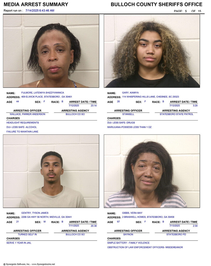 These records are matters of public information provided by the Bulloch County Sheriff’s Office. Booking reports are details of arrests only. All persons below are considered to be innocent unless proven otherwise in a court of law.