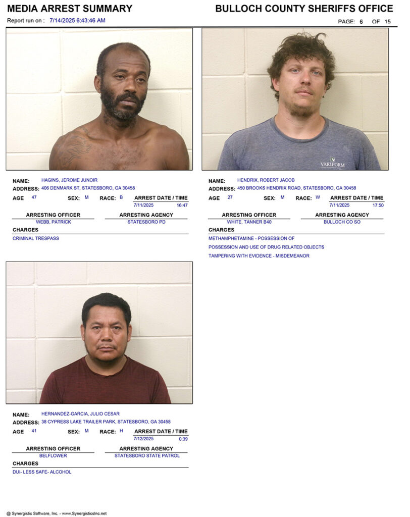 These records are matters of public information provided by the Bulloch County Sheriff’s Office. Booking reports are details of arrests only. All persons below are considered to be innocent unless proven otherwise in a court of law.