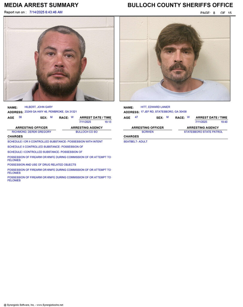 These records are matters of public information provided by the Bulloch County Sheriff’s Office. Booking reports are details of arrests only. All persons below are considered to be innocent unless proven otherwise in a court of law.