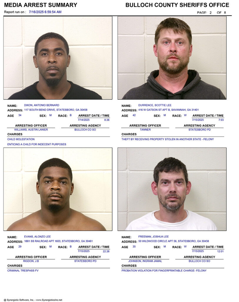 These records are matters of public information provided by the Bulloch County Sheriff’s Office. Booking reports are details of arrests only. All persons below are considered to be innocent unless proven otherwise in a court of law.