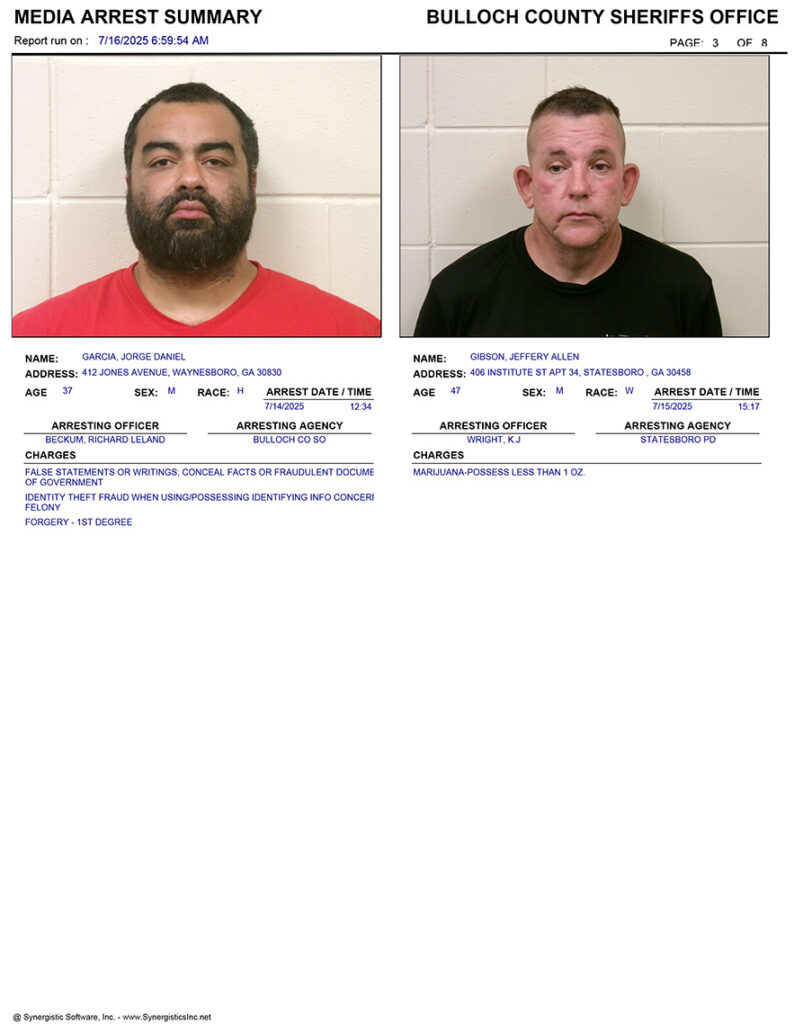These records are matters of public information provided by the Bulloch County Sheriff’s Office. Booking reports are details of arrests only. All persons below are considered to be innocent unless proven otherwise in a court of law.
