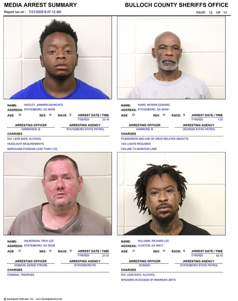 These records are matters of public information provided by the Bulloch County Sheriff’s Office. Booking reports are details of arrests only. All persons below are considered to be innocent unless proven otherwise in a court of law.