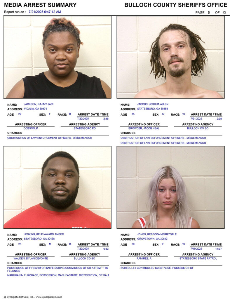 These records are matters of public information provided by the Bulloch County Sheriff’s Office. Booking reports are details of arrests only. All persons below are considered to be innocent unless proven otherwise in a court of law.