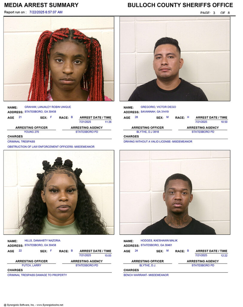 These records are matters of public information provided by the Bulloch County Sheriff’s Office. Booking reports are details of arrests only. All persons below are considered to be innocent unless proven otherwise in a court of law.