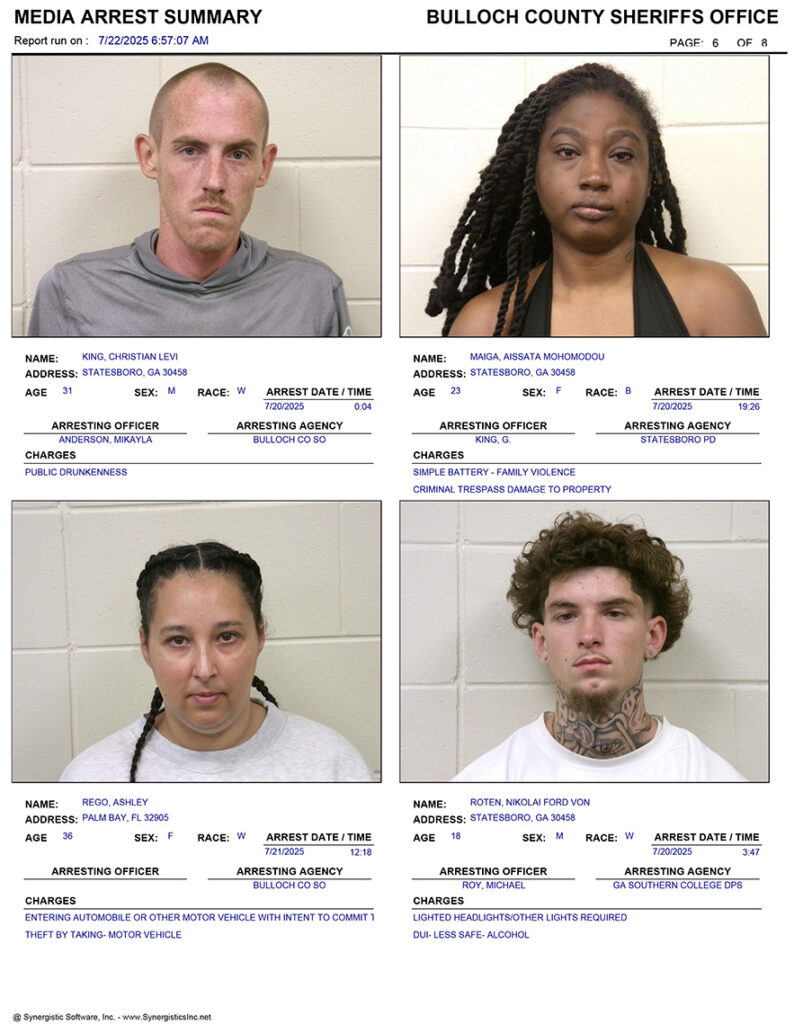 These records are matters of public information provided by the Bulloch County Sheriff’s Office. Booking reports are details of arrests only. All persons below are considered to be innocent unless proven otherwise in a court of law.