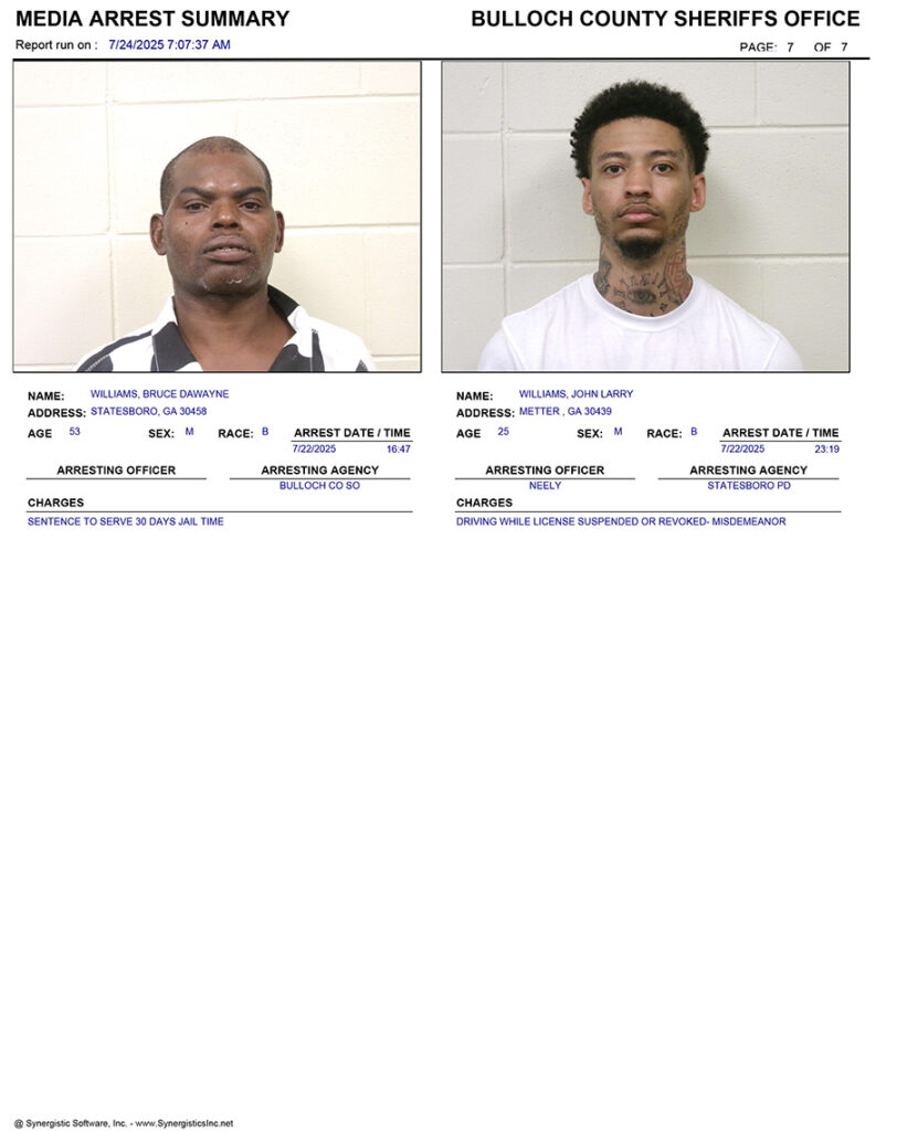 These records are matters of public information provided by the Bulloch County Sheriff’s Office. Booking reports are details of arrests only. All persons below are considered to be innocent unless proven otherwise in a court of law.