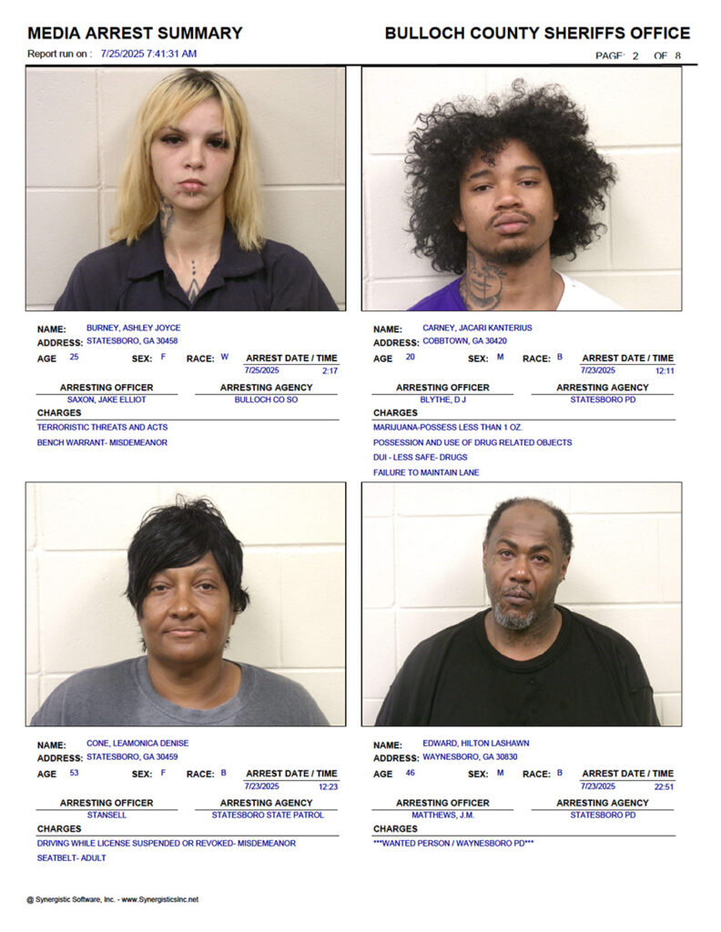 These records are matters of public information provided by the Bulloch County Sheriff’s Office. Booking reports are details of arrests only. All persons below are considered to be innocent unless proven otherwise in a court of law.