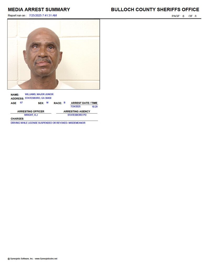 These records are matters of public information provided by the Bulloch County Sheriff’s Office. Booking reports are details of arrests only. All persons below are considered to be innocent unless proven otherwise in a court of law.
