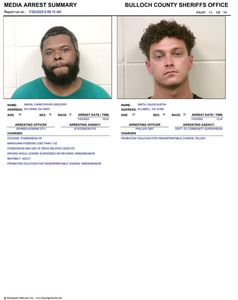 These records are matters of public information provided by the Bulloch County Sheriff’s Office. Booking reports are details of arrests only. All persons below are considered to be innocent unless proven otherwise in a court of law.