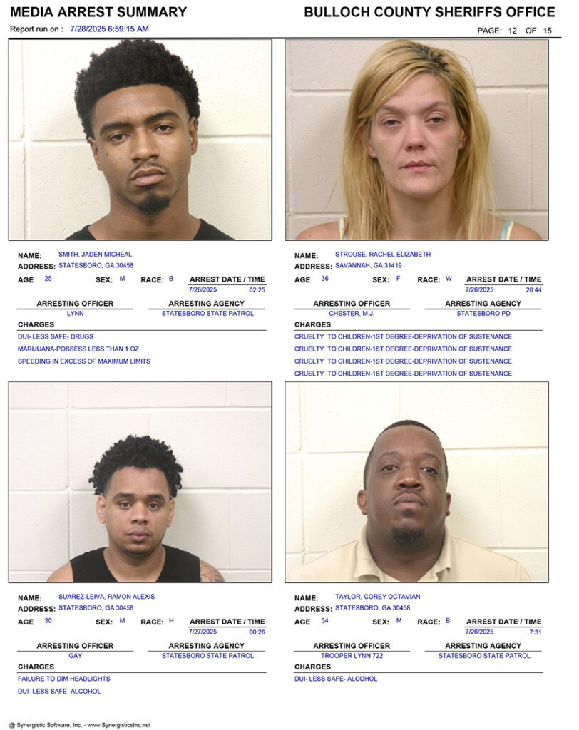 These records are matters of public information provided by the Bulloch County Sheriff’s Office. Booking reports are details of arrests only. All persons below are considered to be innocent unless proven otherwise in a court of law.