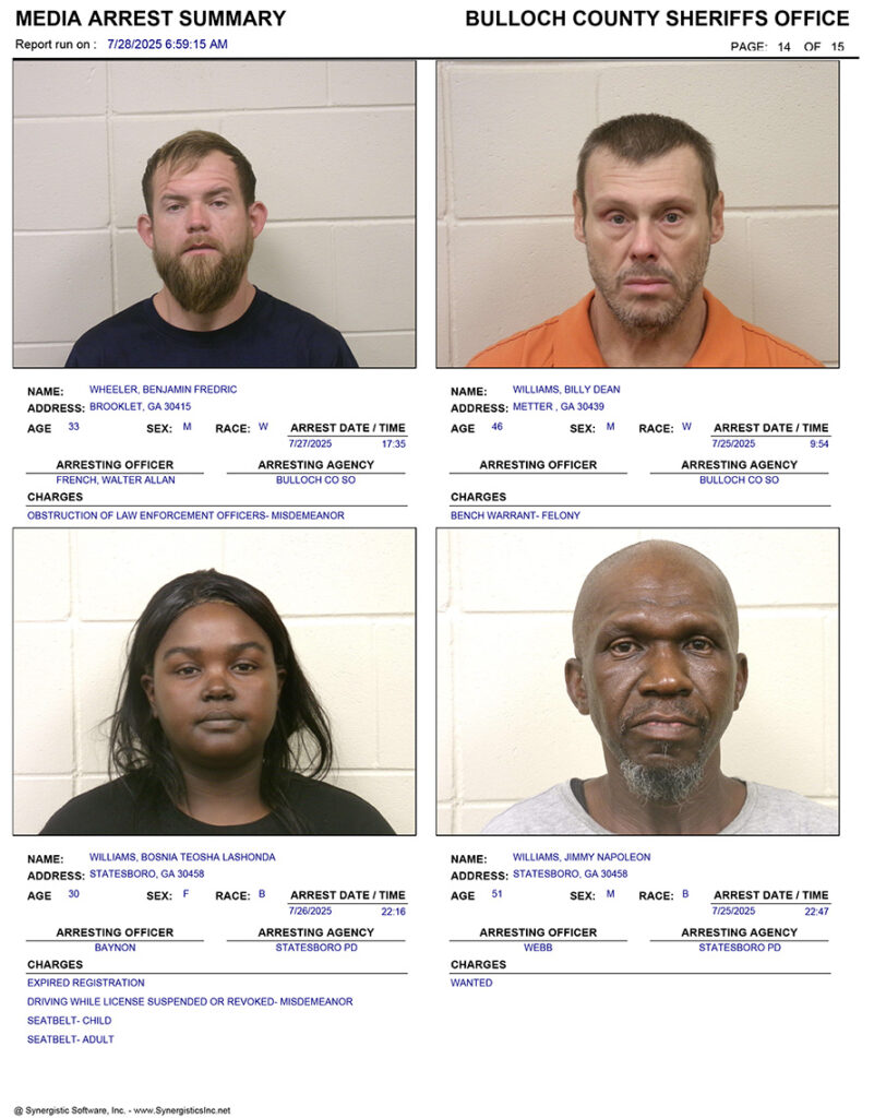 These records are matters of public information provided by the Bulloch County Sheriff’s Office. Booking reports are details of arrests only. All persons below are considered to be innocent unless proven otherwise in a court of law.