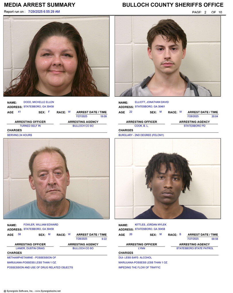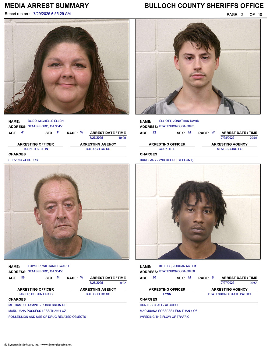 These records are matters of public information provided by the Bulloch County Sheriff’s Office. Booking reports are details of arrests only. All persons below are considered to be innocent unless proven otherwise in a court of law.