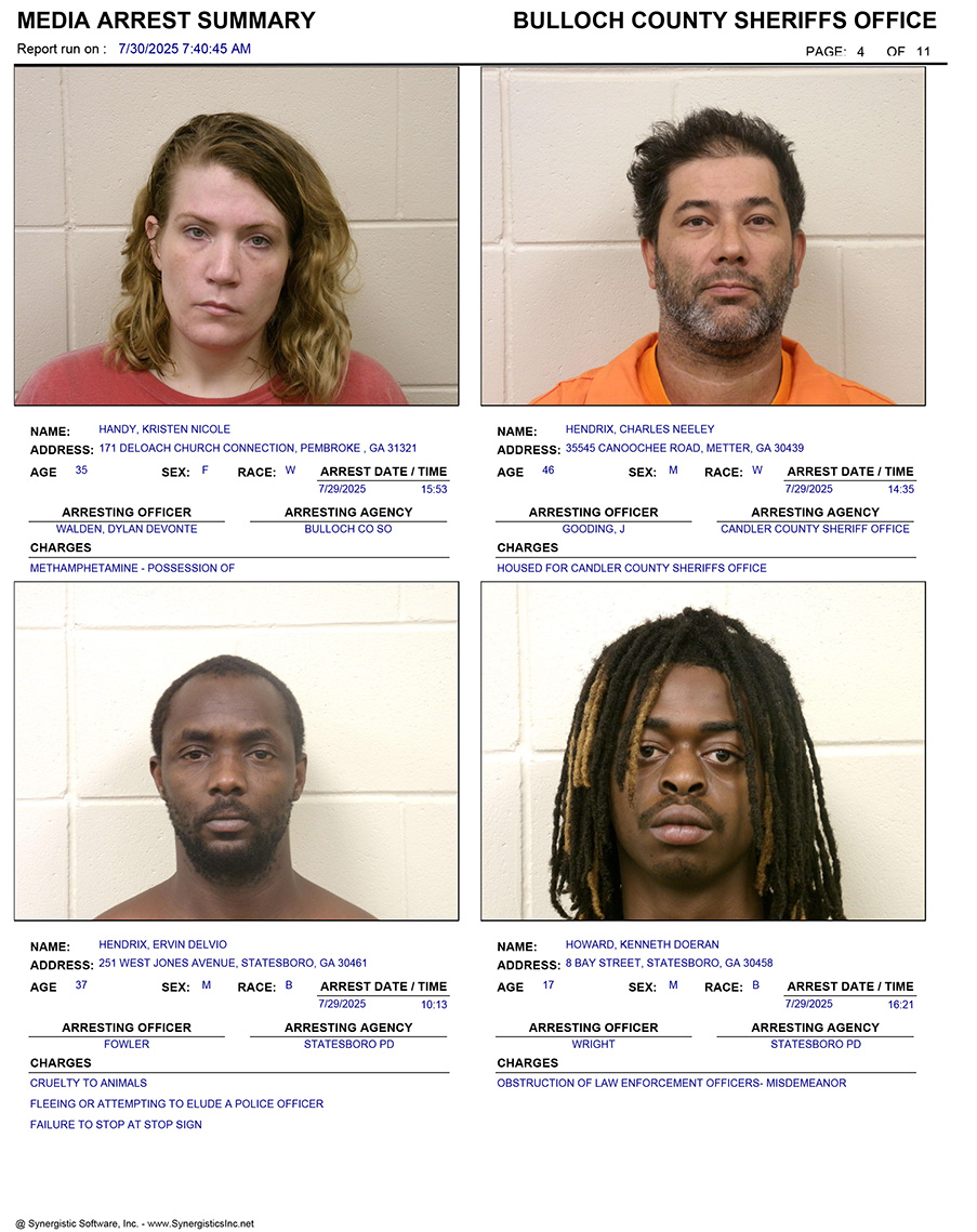 These records are matters of public information provided by the Bulloch County Sheriff’s Office. Booking reports are details of arrests only. All persons below are considered to be innocent unless proven otherwise in a court of law.