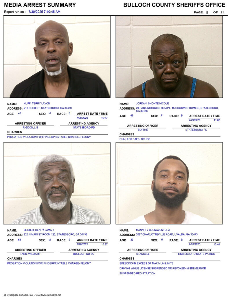 These records are matters of public information provided by the Bulloch County Sheriff’s Office. Booking reports are details of arrests only. All persons below are considered to be innocent unless proven otherwise in a court of law.