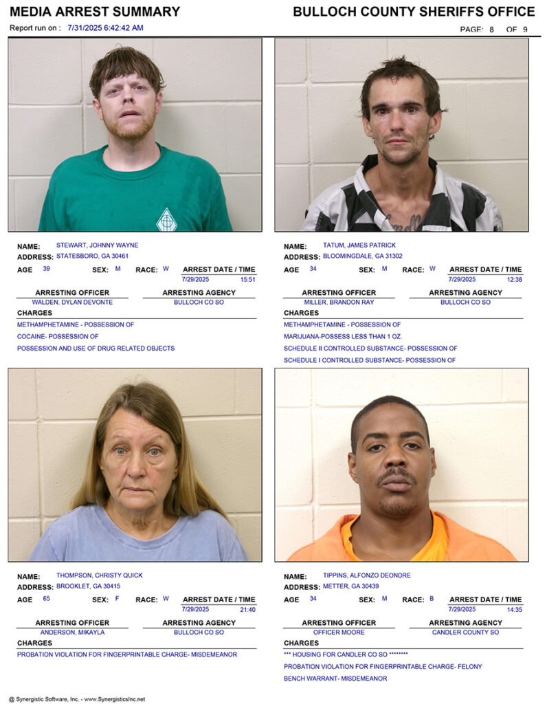 These records are matters of public information provided by the Bulloch County Sheriff’s Office. Booking reports are details of arrests only. All persons below are considered to be innocent unless proven otherwise in a court of law.