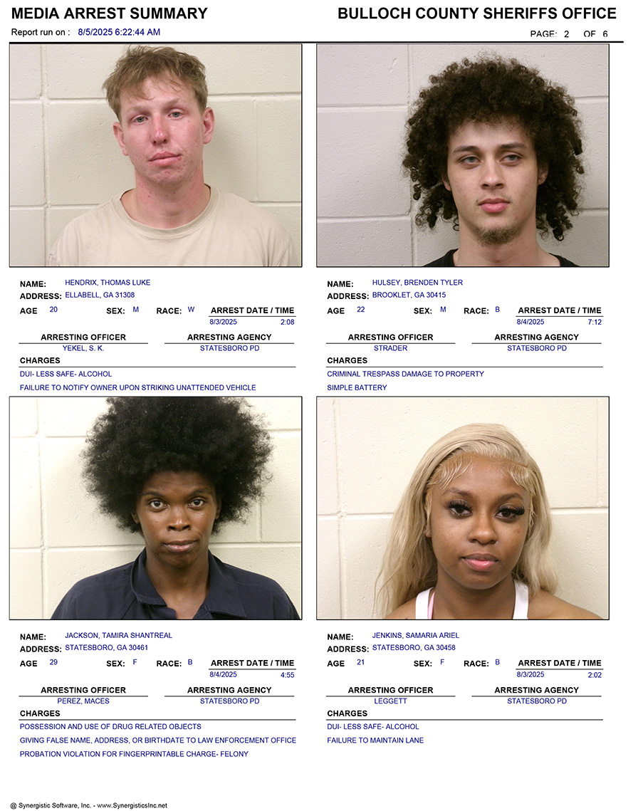 These records are matters of public information provided by the Bulloch County Sheriff’s Office. Booking reports are details of arrests only. All persons below are considered to be innocent unless proven otherwise in a court of law.