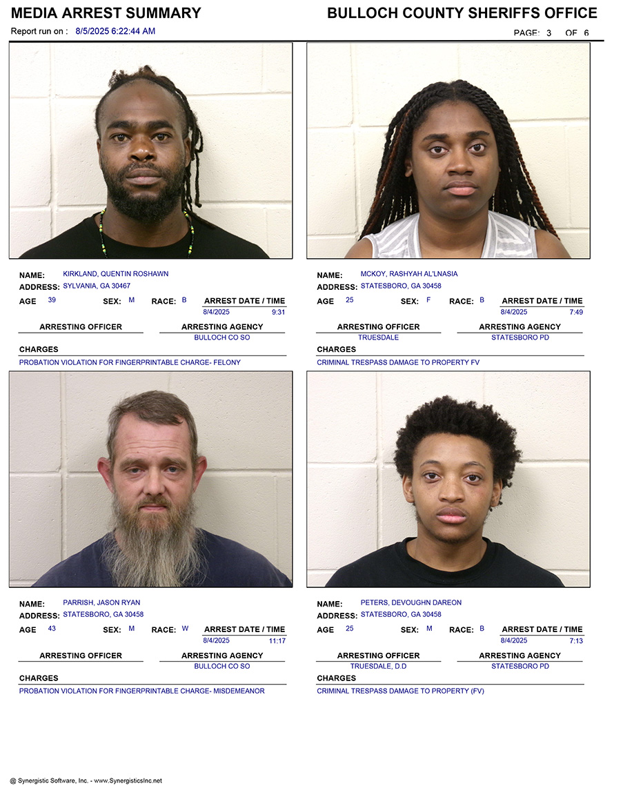 These records are matters of public information provided by the Bulloch County Sheriff’s Office. Booking reports are details of arrests only. All persons below are considered to be innocent unless proven otherwise in a court of law.