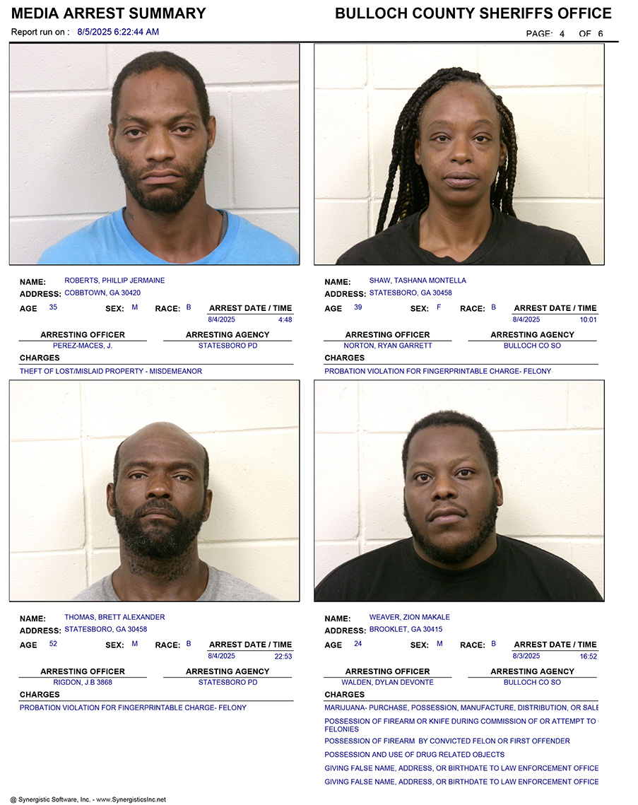 These records are matters of public information provided by the Bulloch County Sheriff’s Office. Booking reports are details of arrests only. All persons below are considered to be innocent unless proven otherwise in a court of law.
