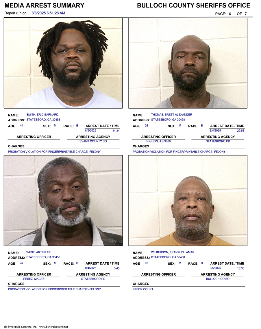These records are matters of public information provided by the Bulloch County Sheriff’s Office. Booking reports are details of arrests only. All persons below are considered to be innocent unless proven otherwise in a court of law.