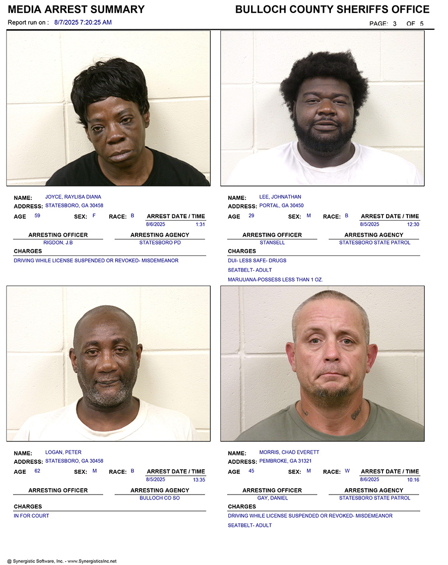 These records are matters of public information provided by the Bulloch County Sheriff’s Office. Booking reports are details of arrests only. All persons below are considered to be innocent unless proven otherwise in a court of law.