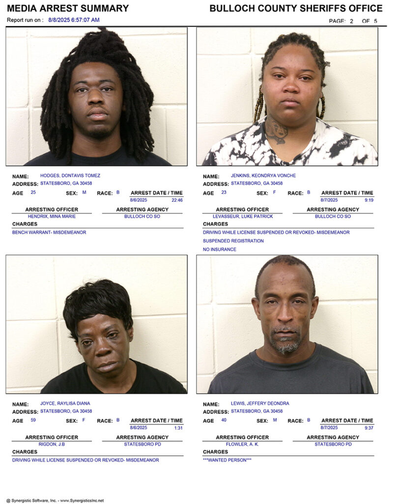 These records are matters of public information provided by the Bulloch County Sheriff’s Office. Booking reports are details of arrests only. All persons below are considered to be innocent unless proven otherwise in a court of law.