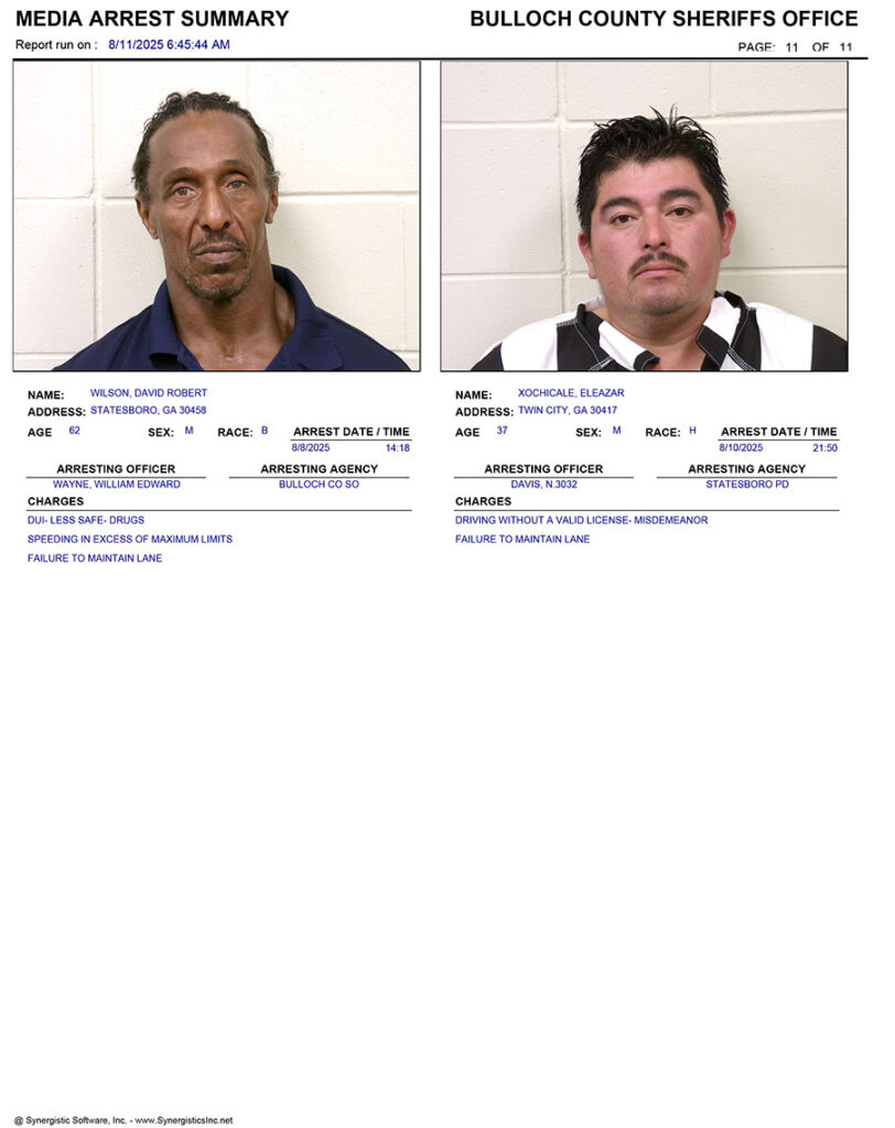 These records are matters of public information provided by the Bulloch County Sheriff’s Office. Booking reports are details of arrests only. All persons below are considered to be innocent unless proven otherwise in a court of law.