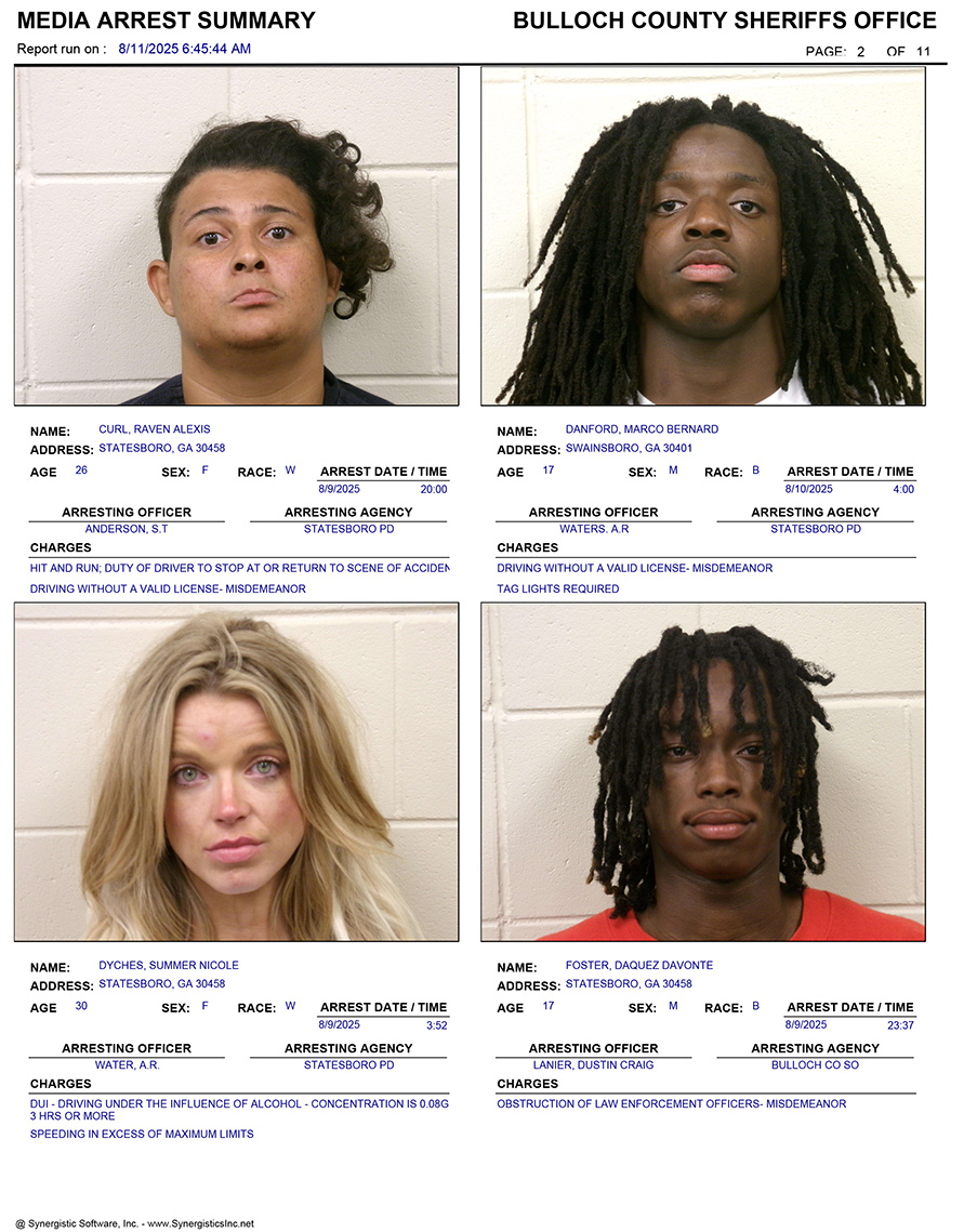 These records are matters of public information provided by the Bulloch County Sheriff’s Office. Booking reports are details of arrests only. All persons below are considered to be innocent unless proven otherwise in a court of law.