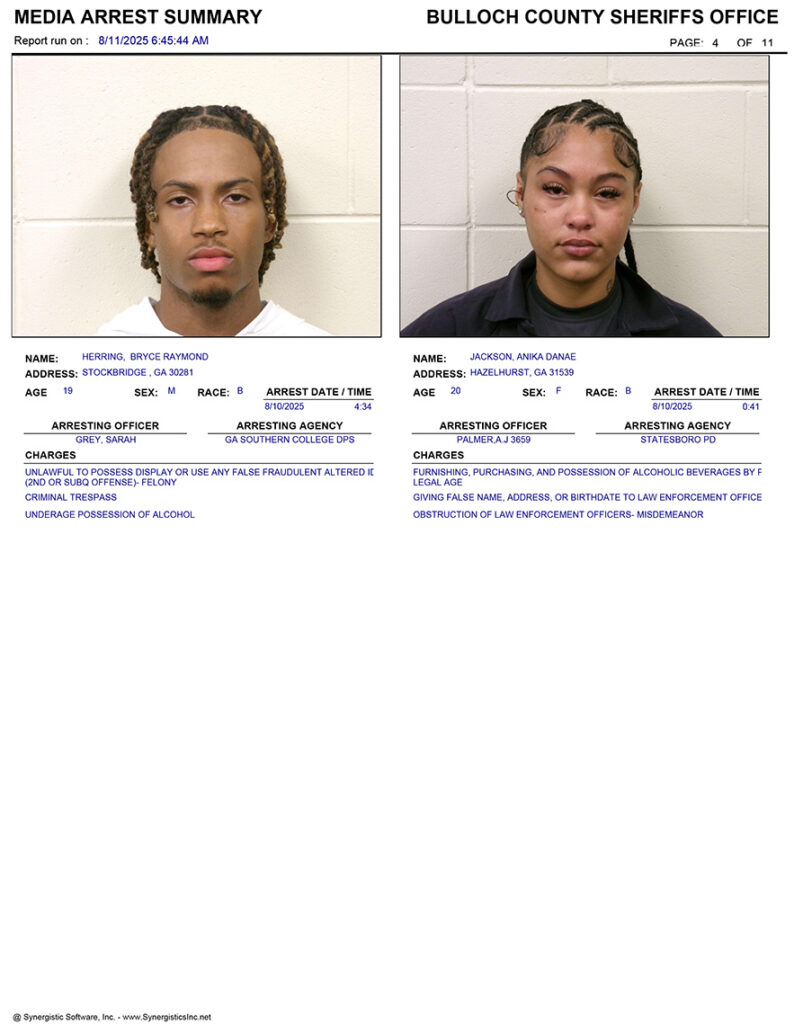 These records are matters of public information provided by the Bulloch County Sheriff’s Office. Booking reports are details of arrests only. All persons below are considered to be innocent unless proven otherwise in a court of law.