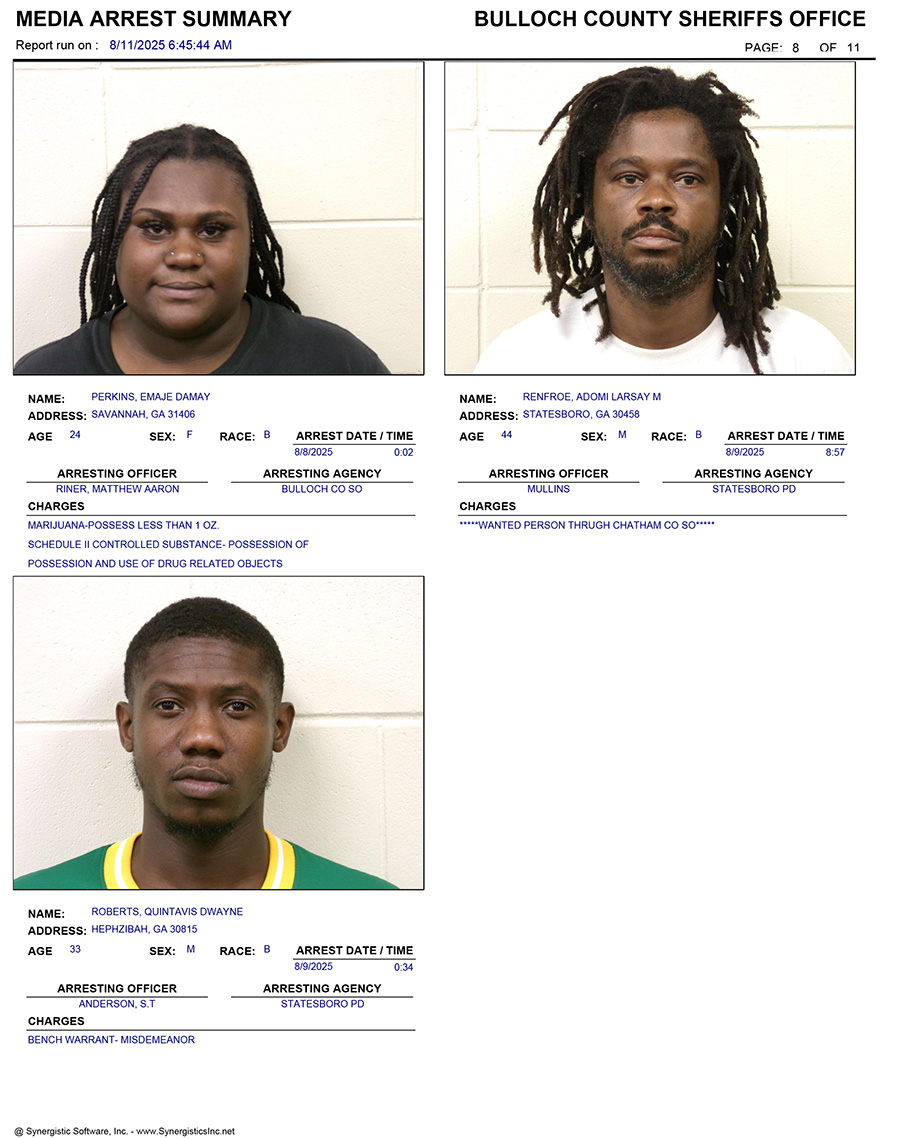 These records are matters of public information provided by the Bulloch County Sheriff’s Office. Booking reports are details of arrests only. All persons below are considered to be innocent unless proven otherwise in a court of law.