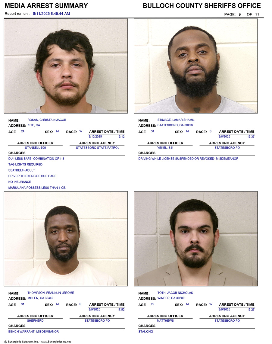 These records are matters of public information provided by the Bulloch County Sheriff’s Office. Booking reports are details of arrests only. All persons below are considered to be innocent unless proven otherwise in a court of law.