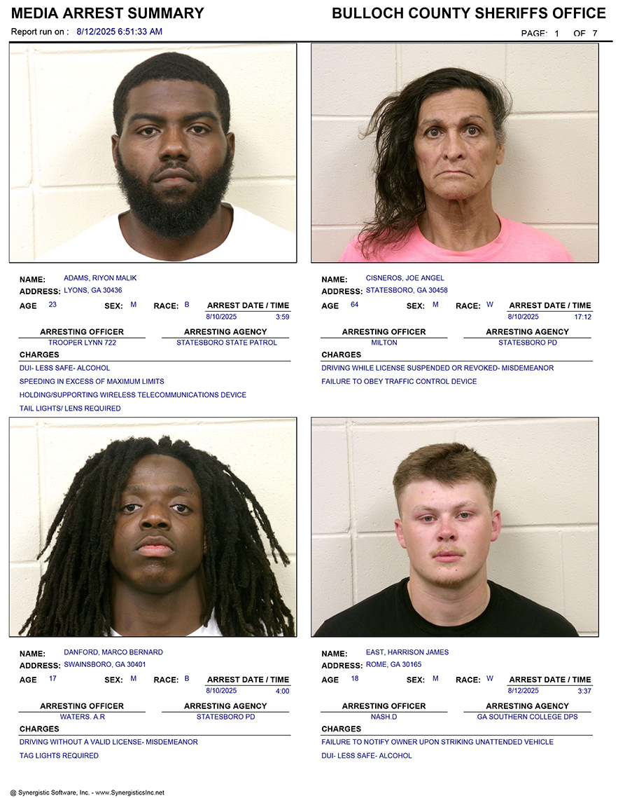 These records are matters of public information provided by the Bulloch County Sheriff’s Office. Booking reports are details of arrests only. All persons below are considered to be innocent unless proven otherwise in a court of law.