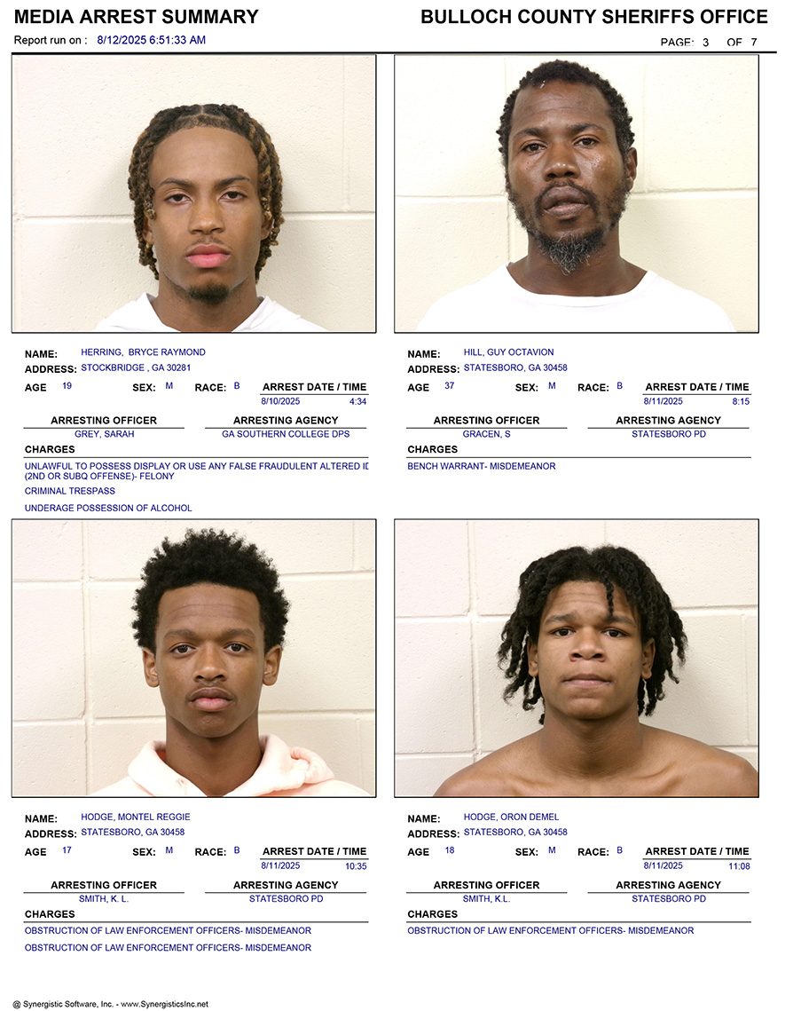 These records are matters of public information provided by the Bulloch County Sheriff’s Office. Booking reports are details of arrests only. All persons below are considered to be innocent unless proven otherwise in a court of law.