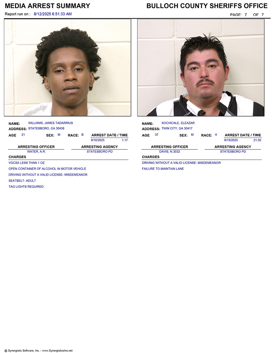 These records are matters of public information provided by the Bulloch County Sheriff’s Office. Booking reports are details of arrests only. All persons below are considered to be innocent unless proven otherwise in a court of law.
