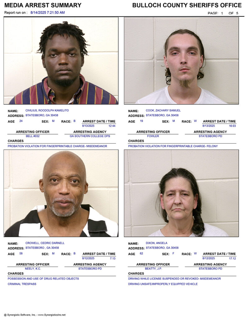 These records are matters of public information provided by the Bulloch County Sheriff’s Office. Booking reports are details of arrests only. All persons below are considered to be innocent unless proven otherwise in a court of law.