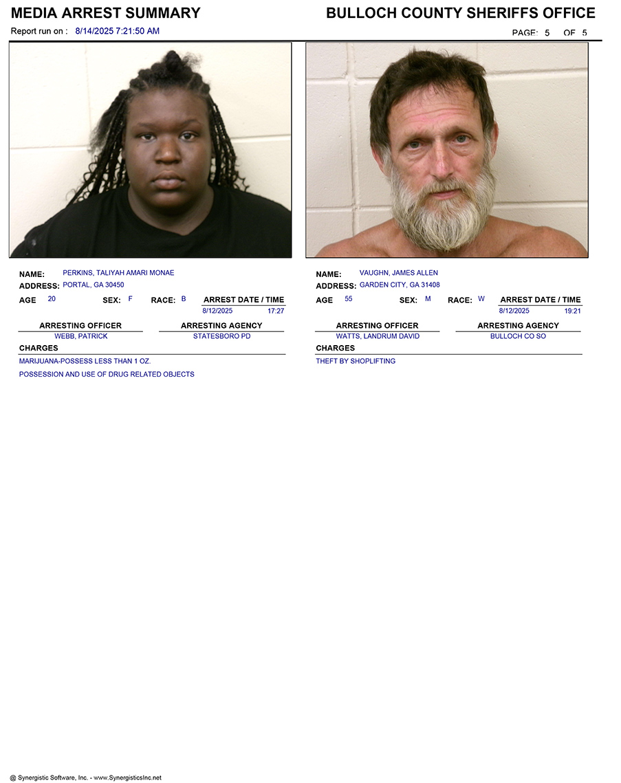 These records are matters of public information provided by the Bulloch County Sheriff’s Office. Booking reports are details of arrests only. All persons below are considered to be innocent unless proven otherwise in a court of law.