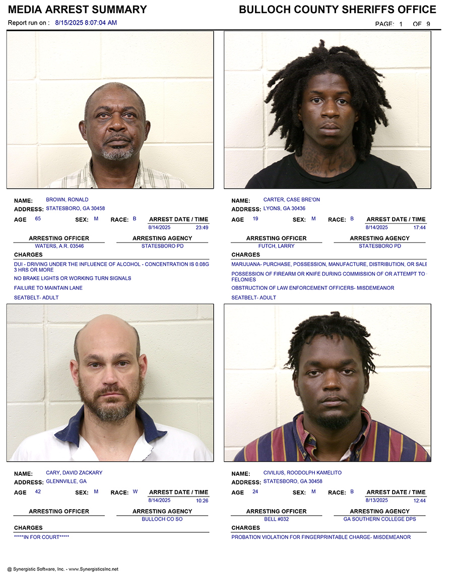 These records are matters of public information provided by the Bulloch County Sheriff’s Office. Booking reports are details of arrests only. All persons below are considered to be innocent unless proven otherwise in a court of law.