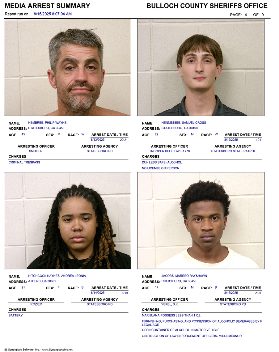 These records are matters of public information provided by the Bulloch County Sheriff’s Office. Booking reports are details of arrests only. All persons below are considered to be innocent unless proven otherwise in a court of law.