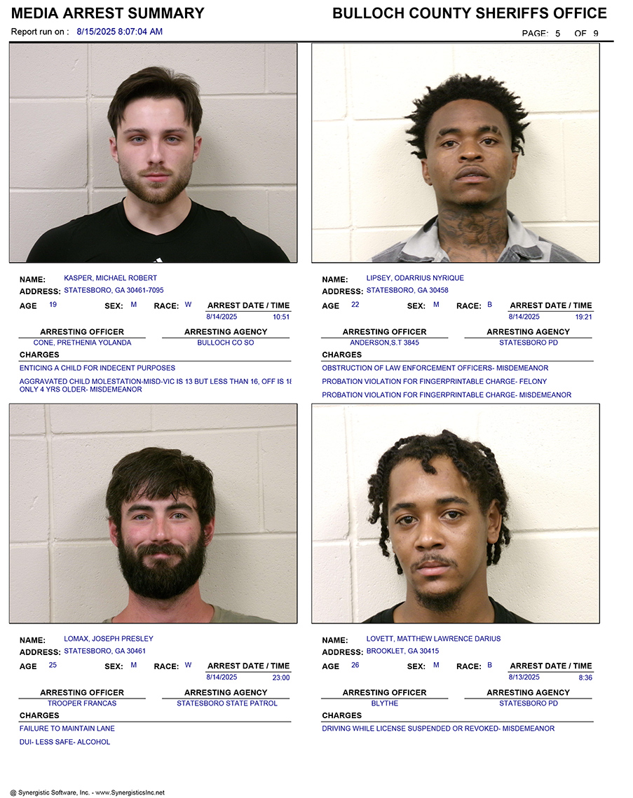 These records are matters of public information provided by the Bulloch County Sheriff’s Office. Booking reports are details of arrests only. All persons below are considered to be innocent unless proven otherwise in a court of law.
