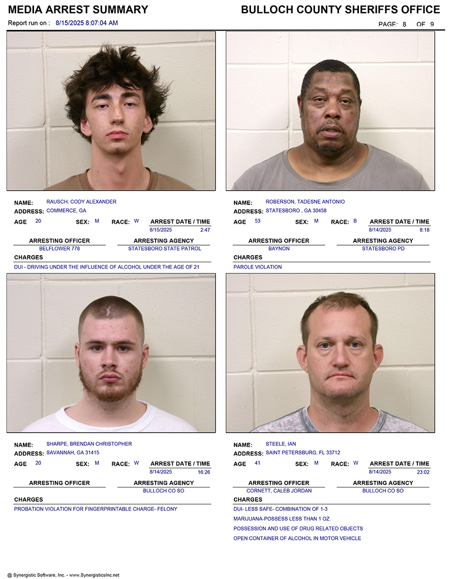 These records are matters of public information provided by the Bulloch County Sheriff’s Office. Booking reports are details of arrests only. All persons below are considered to be innocent unless proven otherwise in a court of law.
