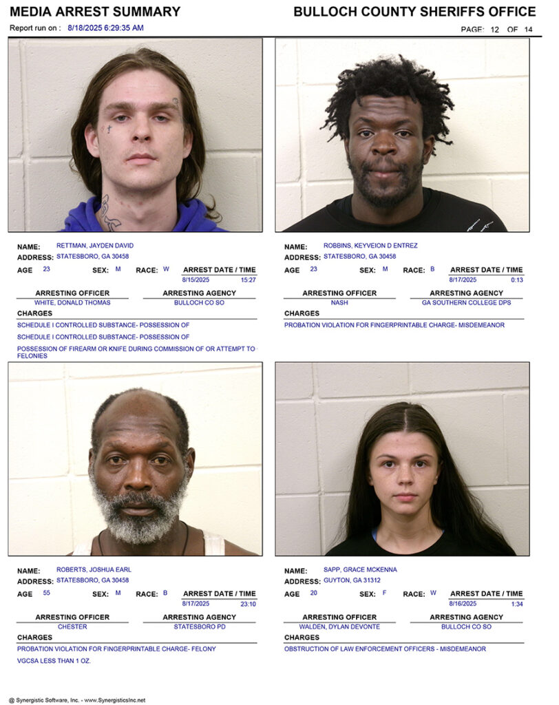 These records are matters of public information provided by the Bulloch County Sheriff’s Office. Booking reports are details of arrests only. All persons below are considered to be innocent unless proven otherwise in a court of law.